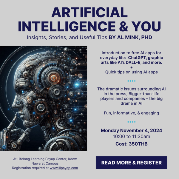 A couple of months ago at our General Meeting, Chris Smith, who heads up the Geeks Club in Chiang Mai, and who is perhaps our longest tenured active member (#21 out of 2000+), started our Learning Series with an interesting and informative look at A.I. The presentation was videoed and we thought you might like to take a look at it, particularly if you were not there to
