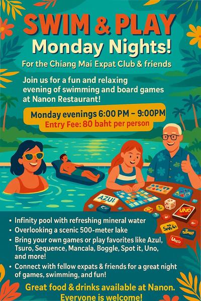 For any information, contact info@chiangmaiexpatsclub.com . Both the Swimming and the Board Games are at the same venue. The place is Na Non Restaurant, Pool & Gym. Map coordinates: https://maps.app.goo.gl/gKNGuXmZ3vQMaYEN7?g_st=am
