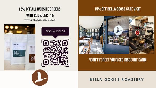 offers 15% of in all 4 cafes with CEC/BG Card and 15% off all online orders with code CEC_15