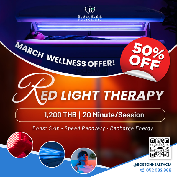 March Wellness Special for Chiang Mai Expats Boost your energy, recovery, and skin health with our Red Light Therapy at Boston Health Polyclinic. ** 50% OFF! Only 1,200 THB (regular price 2,400 THB) Includes: - Doctor Consultation - Personalized Treatment Plan - Private Red Light Therapy Room (20 minutes/session) Feel free to contact us for